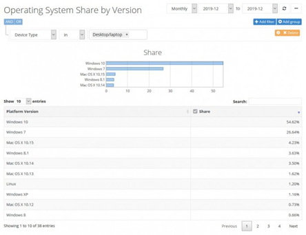不過,Windows 7作為一款已經(jīng)問世十年的操作系統(tǒng),用戶基數(shù)依舊龐大。據(jù)市場(chǎng)調(diào)查機(jī)構(gòu)Netmarketshare發(fā)布的報(bào)告顯示,2019年12月,Windows 10系統(tǒng)市場(chǎng)份額占比達(dá)到54.62%,而Windows 7位居第二,為26.64%。