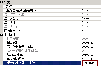 第二處在,選擇左側(cè)的站點(diǎn),然后找到后側(cè)的IIS——ASP打開,找到(圖-2)的位置,可以看到默認(rèn)200000的限制(200KB),修改成需要的大小即可